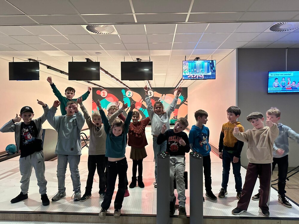Op een woensdag is dat feestje met het hele team (op 1 zieke na) gevierd. Er is fanatiek gebowld waarbij er verschillende creatieve worpen werden uitgevoerd. Na deze sportieve prestatie is het hele team gezellig aangeschoven voor een portie frietjes met een snack. Het werd zowaar even stil. Limonade maakte het feest compleet en moe en voldaan konden alle kinderen weer naar huis. Het was een geslaagde prijs en zeer goed voor de teamspirit 👏🏀💪